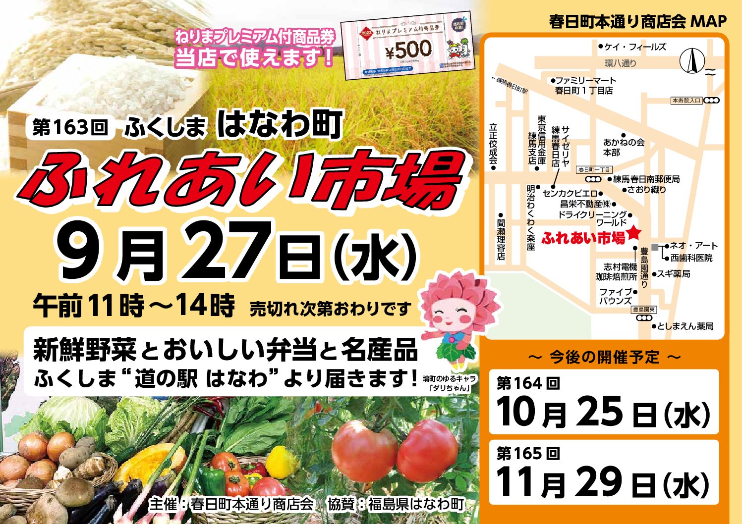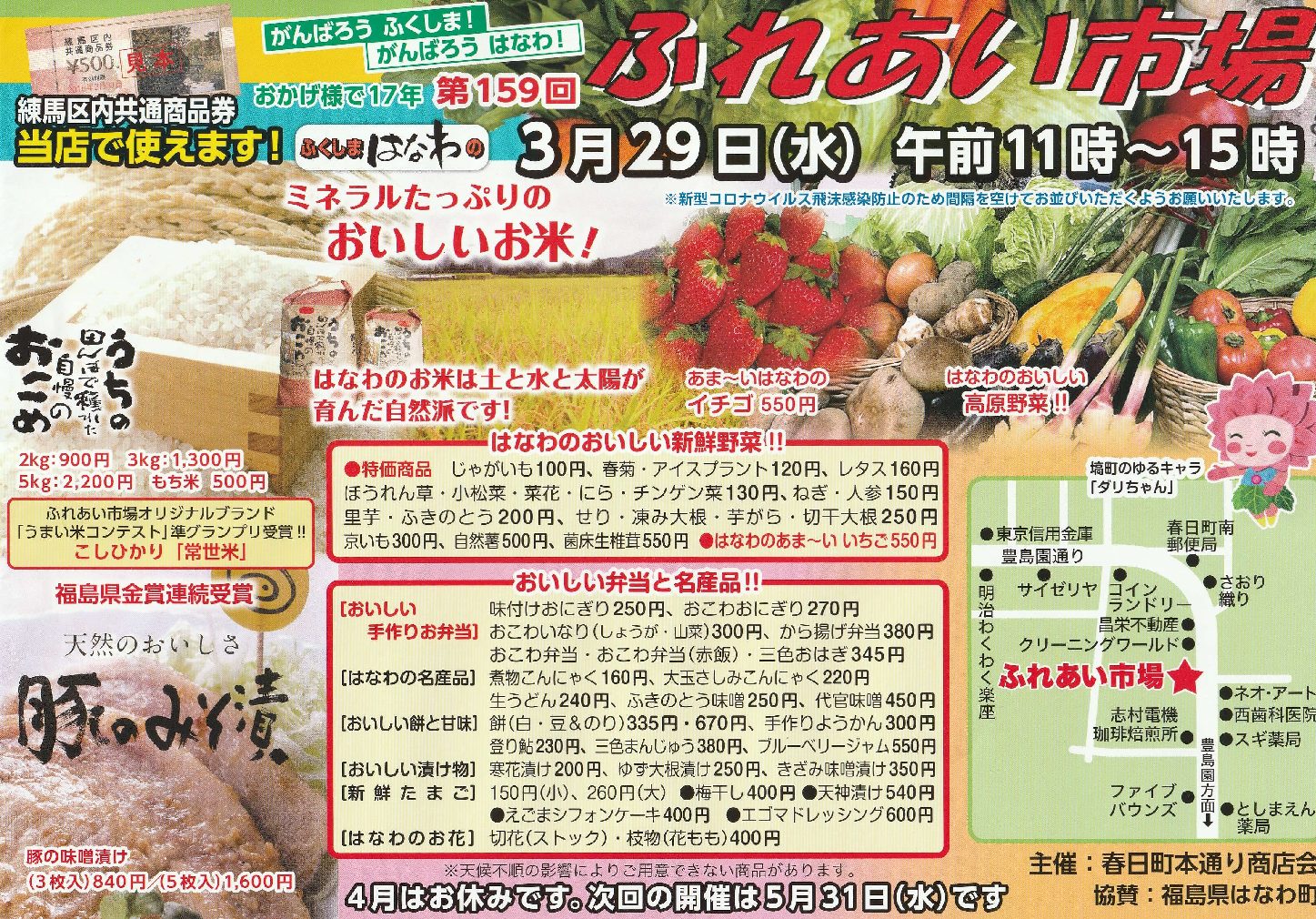 突然のこととなりましたが、15年以上にわたって開催されてきた「ふれあい市場」が今回と次回165回をもって開催を終了することになりました。長い間ご愛顧頂いた地域の方々及び遠くから購入の為に来ていただいた方々、そしてここまで新鮮な生産物を届けて下さってきた福島県はなわ町の方々に感謝を申し上げます。後2日ですが、最後まで全力で開催します。よろしくお願いいたします。