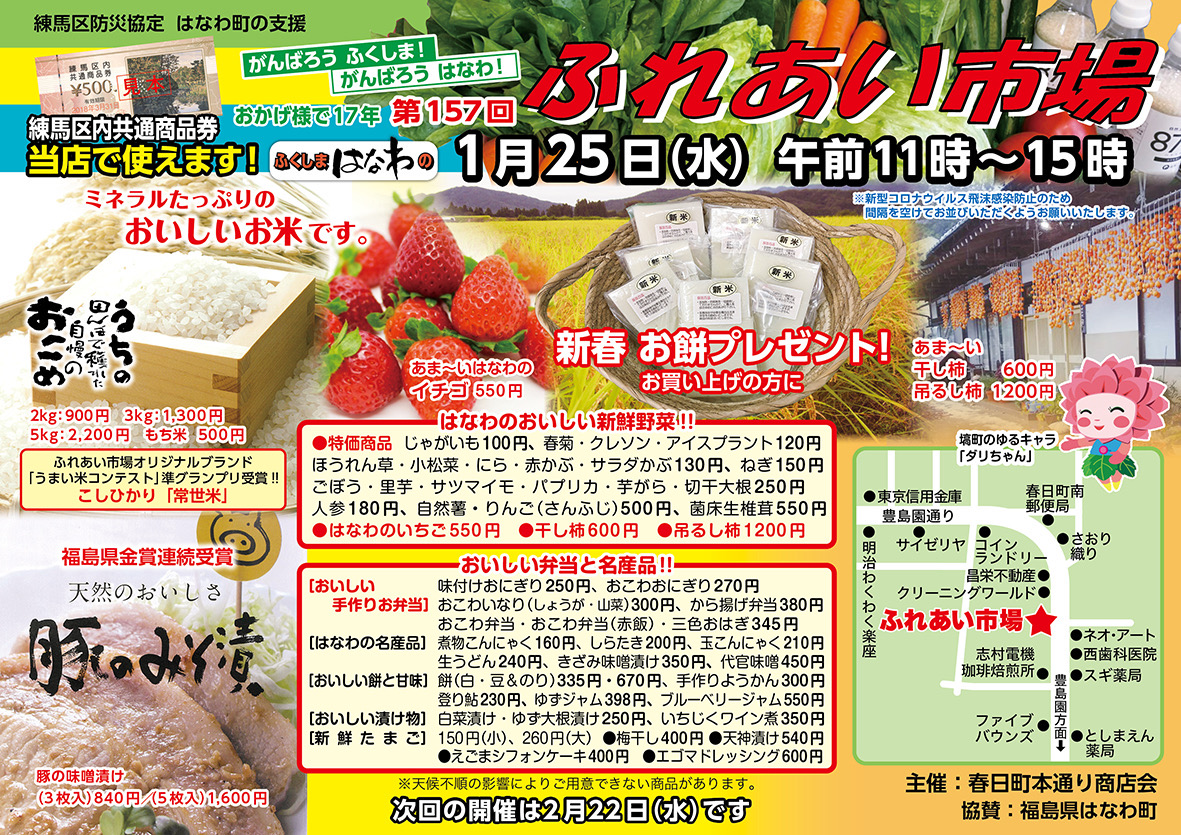 第157回 ふれあい市場 1月25日(水)開催しました。 東北ふるさと事業 2023.02.102023.02.11 2023年の最初のふれあい市場が1月25日に開催されました。 当日は1000円以上のご購入いただいたお客様にお餅をプレゼントがありました。